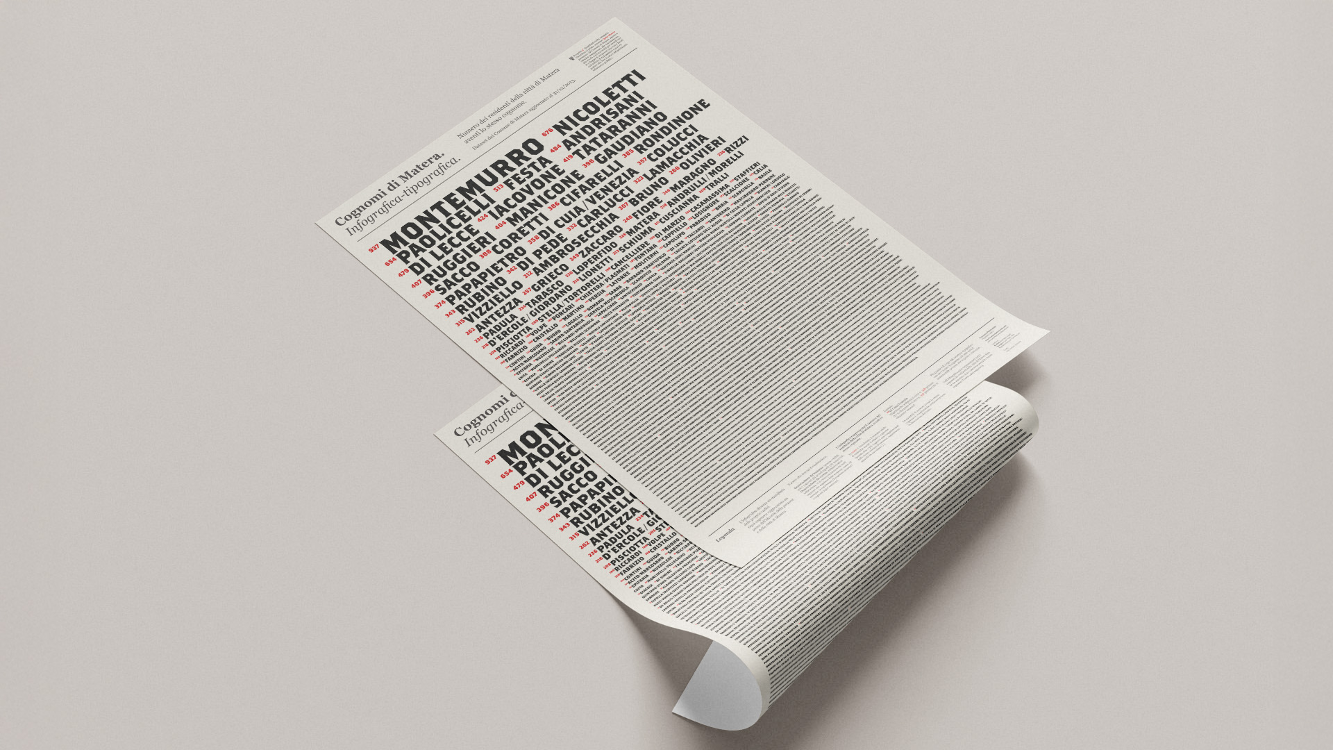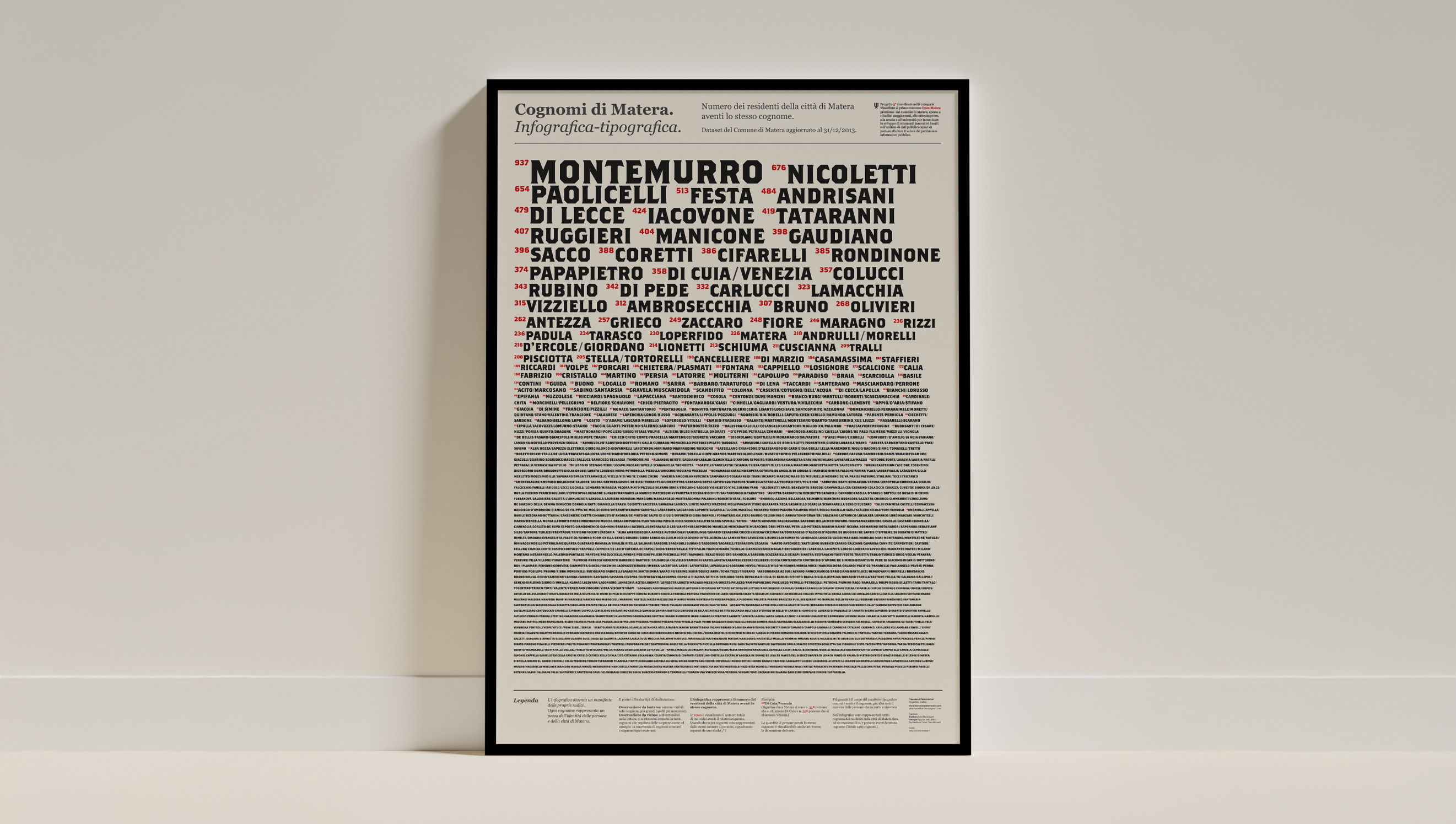 The poster can be viewed in two ways: observation from afar whereby only the larger and most common surnames will be legible and close observation by immerging oneself in the literature only to discover a few surprises, such as the coexistence of foreign names alongside the more traditional.